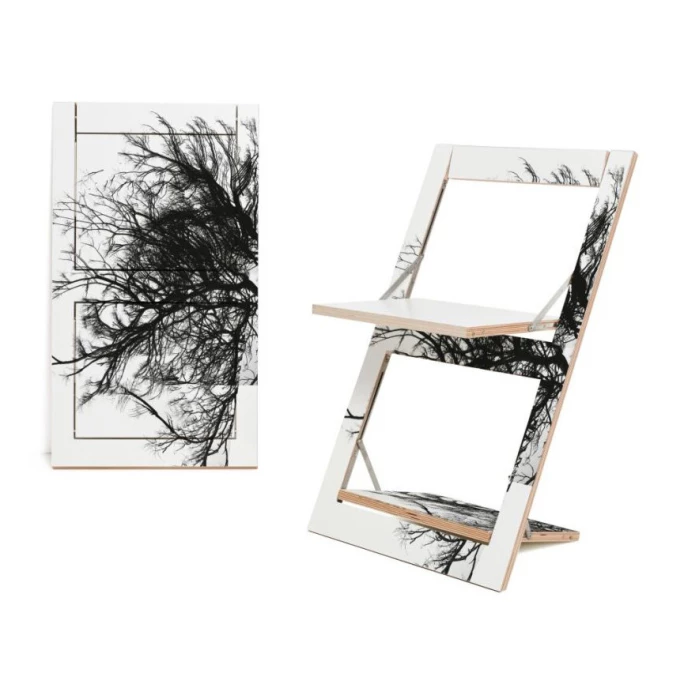 Mit dem spektakulären Klappstuhl FLÄPPS BAUM des Berliner Unternehmens AMBIVALENZ legen Sie sich ein erstaunlich bequemes Sitzmöbel mit ausgeklügelter Funktionalität zu. Ob als Esszimmerstuhl, gelegentlichem Gästestuhl, Bild an der Wand, oder auch mal als Nachttisch in Ihrem Schlafzimmer, der Fläpps Klappstuhl zieht einerseits mit Purismus, ja sogar Minimalismus, andererseits mit designstarken Motiven und pfiffiger Technik alle Blicke auf sich. Der Stuhl besteht aus Birkensperrholz und dem Mechanismus aus Edelstahl. Dabei verbirgt der nur 20mm starke Klappstuhl FLÄPPS eine komplexe Technik. Eine innere Mechanik lässt Fuß- und Sitz-Teil synchron mit einem Handgriff ein- und ausgleiten und die flexible Rückenlehne und das angenehme Schwingen machen FLÄPPS zu einem überraschend bequemen Klappstuhl (-Freischwinger). Räume sind nicht zu klein – einige Möbel sind einfach nur unpassend! Die System-Möbel von AMBIVALENZ geben Ihnen die Freiheit sich nicht festlegen zu müssen. Aus der Serie FLÄPPS erhalten Sie platzsparende Design-Möbel wie z. B. Regale, Tische, Stühle und Garderoben, welche unendliche Kombinationsmöglichkeiten bieten für ein maximal flexibles und mobiles Leben. Nur in Benutzung zeigen sich die Produkte als spektakuläre Design Möbel. Ungenutzt verschwinden sie gänzlich oder werden zu kunstvoller Deko an der Wand. Mit dem Design-Klappstuhl FLÄPPS haben Sie immer einen Ersatzstuhl parat! Oder Sie stellen sich Ihre komplette Essgruppe mit BAUM oder in Kombination ( FÄPPS ist aktuell in über 20 Designs erhältlich ) bunt mit diesen praktischen Esszimmerstühlen von AMBIVALENZ zusammen – platzsparend und spektakulär stylish!