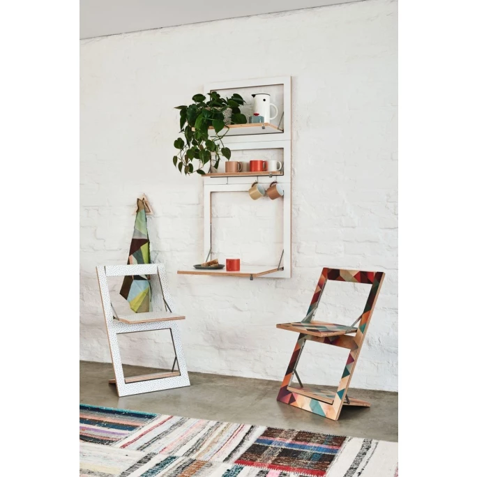 Mit dem spektakulären Klappstuhl FLÄPPS CRISS-CROSS-ROT des Berliner Unternehmens AMBIVALENZ legen Sie sich ein erstaunlich bequemes Sitzmöbel mit ausgeklügelter Funktionalität zu. Ob als Esszimmerstuhl, gelegentlichem Gästestuhl, Bild an der Wand, oder auch mal als Nachttisch in Ihrem Schlafzimmer, der Fläpps Klappstuhl zieht einerseits mit Purismus, ja sogar Minimalismus, andererseits mit designstarken Motiven und pfiffiger Technik alle Blicke auf sich. Der Stuhl besteht aus Birkensperrholz und dem Mechanismus aus Edelstahl. Dabei verbirgt der nur 20mm starke Klappstuhl FLÄPPS eine komplexe Technik. Eine innere Mechanik lässt Fuß- und Sitz-Teil synchron mit einem Handgriff ein- und ausgleiten und die flexible Rückenlehne und das angenehme Schwingen machen FLÄPPS zu einem überraschend bequemen Klappstuhl (-Freischwinger). Räume sind nicht zu klein – einige Möbel sind einfach nur unpassend! Die System-Möbel von AMBIVALENZ geben Ihnen die Freiheit sich nicht festlegen zu müssen. Aus der Serie FLÄPPS erhalten Sie platzsparende Design-Möbel wie z. B. Regale, Tische, Stühle und Garderoben, welche unendliche Kombinationsmöglichkeiten bieten für ein maximal flexibles und mobiles Leben. Nur in Benutzung zeigen sich die Produkte als spektakuläre Design Möbel. Ungenutzt verschwinden sie gänzlich oder werden zu kunstvoller Deko an der Wand. Mit dem Design-Klappstuhl FLÄPPS haben Sie immer einen Ersatzstuhl parat! Oder Sie stellen sich Ihre komplette Essgruppe mit CRISS-CROSS-ROT oder in Kombination ( FÄPPS ist aktuell in über 20 Designs erhältlich ) bunt mit diesen praktischen Esszimmerstühlen von AMBIVALENZ zusammen – platzsparend und spektakulär stylish!
