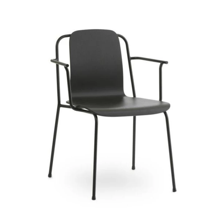 Der Normann Copenhagen Studio Armchair Stuhl ist kurzum ein rundum ästhetischer und harmonischer Stuhl. Der dänische Designer Simon Legald hat auf eine einfache Konstruktion aus Furnier und Stahlrohr gesetzt. Die Stühle erinnern somit an ältere französische Fabrikstühle und verleihen der Studio Serie industrielle Referenzen. Die klare Formsprache des Studio Armchair Stuhls findet ihr Gegengewicht in den abgerundeten Ecken und der geschwungenen Taille. Das Design des Normann Copenhagen Studio Armchair Stuhls ist zeitlos und verfügt über eine harmonische und einladende Optik. Betrachtet man den Studio Armchair Stuhl etwas näher, entdeckt man zahlreiche dezente Details, die klar signalisieren, dass alle Designkomponenten wohldurchdacht und sorgfältig ausgearbeitet sind. So wurden zum Beispiel in Studio Chair keine Standardkomponenten verarbeitet. Stattdessen sorgen maßgeschneiderte Lösungen für eine überzeugende Ästhetik, egal von welcher Seite aus man den Stuhl betrachtet. Studio Armchair wirkt vertraut und neu zugleich, neutral und trotzdem charaktervoll, intim, aber nicht dominierend, schlicht, aber dennoch komplex, klar definiert und zugleich kurvenreich. Mit anderen Worten: Studio Armchair ist ein Schalenstuhl, wie er unserer Meinung nach sein sollte.